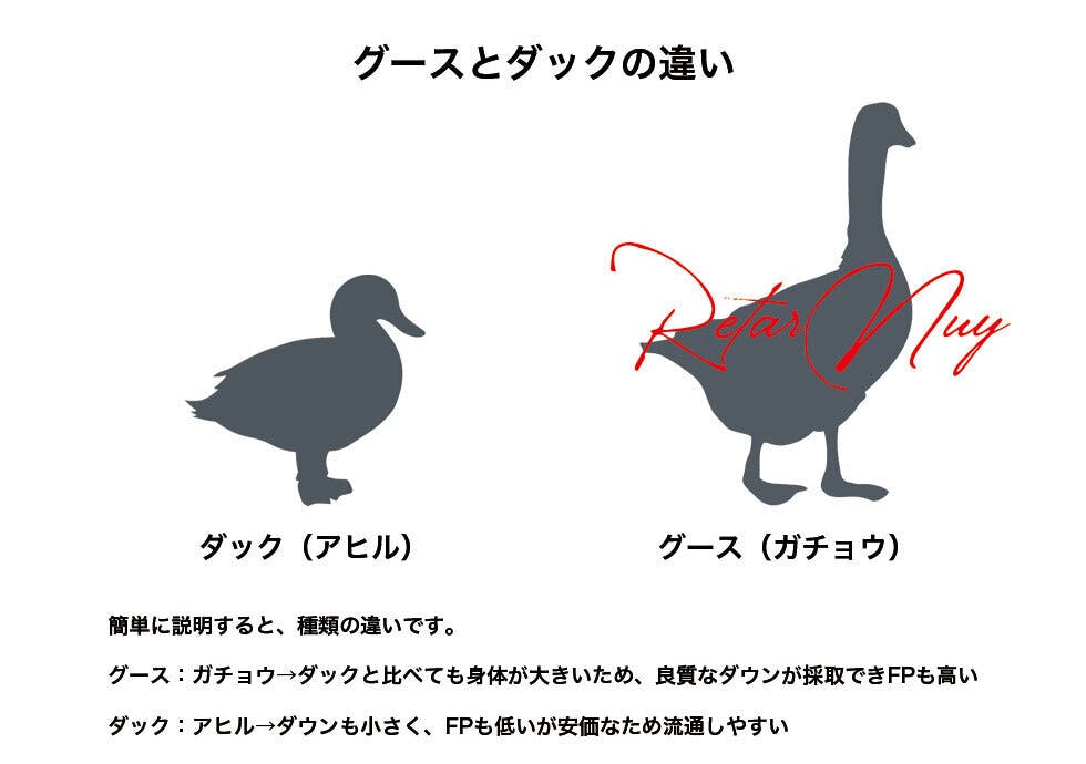 Retar Nuyでは、より高品質なダウンを使用するため『グースダウン』を採用しています。