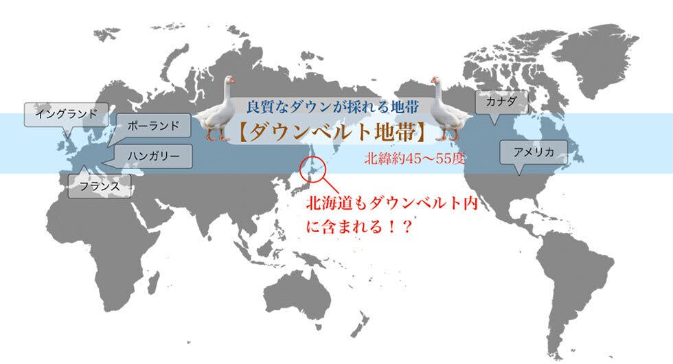 良質なダウンが採れる地帯のことをダウンベルトと呼ぶそうです。