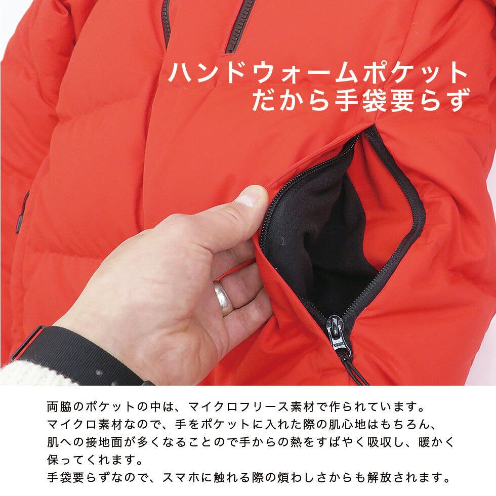 冷えてしまいがちな手もポケットに入れる事で、マイクロフリースが発熱を促しダウンに包まれているので、すぐに暖かくなり保温性も高い。