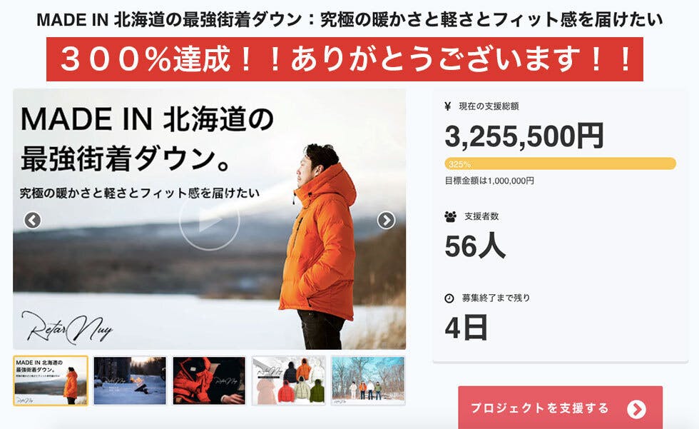 北海道から最高のダウンジャケットを届けたい!是非、よろしくお願いいたします!