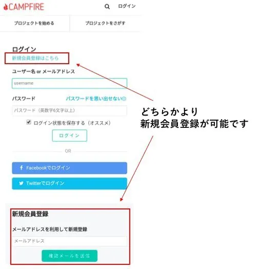 こちら(https://camp-fire.jp/login)の新規登録画面より、会員登録へお進みください。