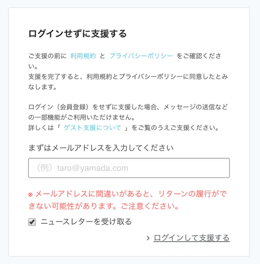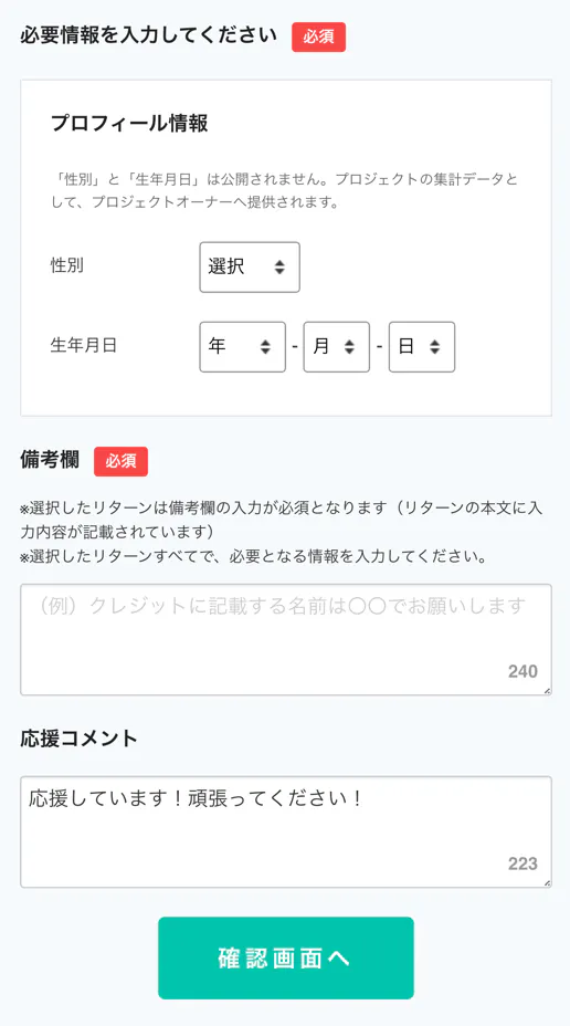ご希望のリターンを支援いただいたあと、下記の流れで必要事項をご記載いただきます。