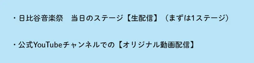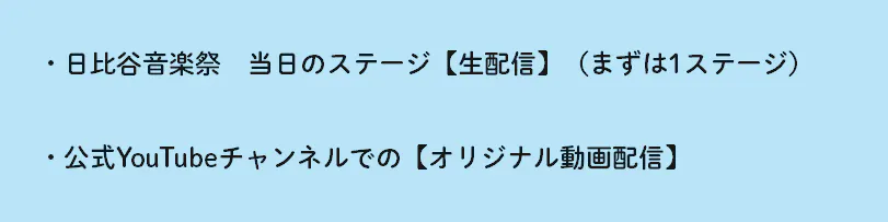 様々なアーティストが出演する日比谷音楽祭 当日のステージの様子をまずは1ステージからではありますが、日比谷音楽祭公式YouTubeチャンネル(HYC)で生配信します。さまざまな事情で会場に来られない方にも、音楽を届けたい。届けさせてください!