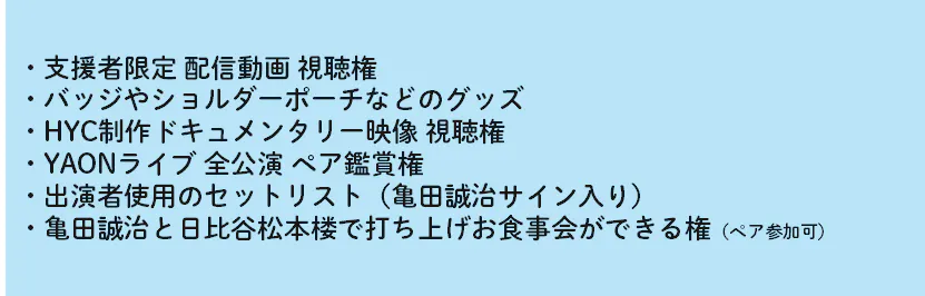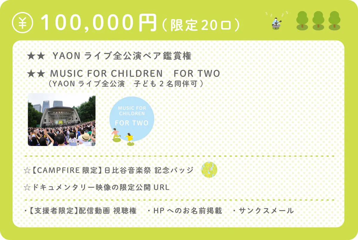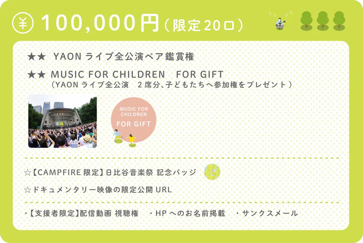 日比谷音楽祭2020のYAONライブに全公演ペアで参加できるコースです。「子どもたちの音楽の芽を育てる」という日比谷音楽祭のコンセプトに沿った「MUSIC FOR CHILDREN」という取り組みによって、普段なかなか音楽ライブ等に参加する機会のない子どもたちにYAONライブの鑑賞権を提供できるプラン(FOR GIFT)です。参加する子どもたちは、東京善意銀行を通じて、東京都内の福祉施設等から希望者を募ります。支援者様には、たっぷりと日比谷音楽祭を満喫していただき、一緒に見届けていただけるコースになっています。<限定20口>のコースです。