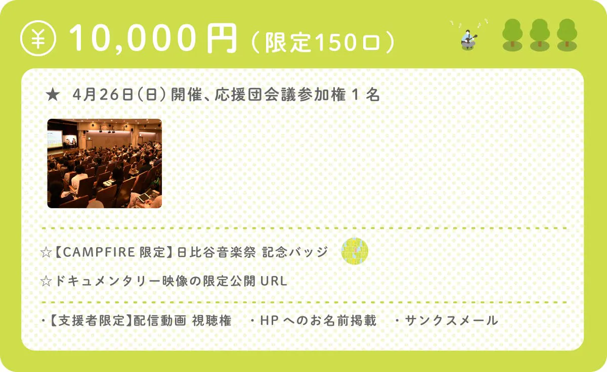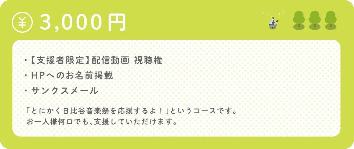 1口3,000円の比較的ご支援いただきやすいものから、日比谷音楽祭以外ではなかなか実現できない希少なものまで、各種リターンをご用意しています。