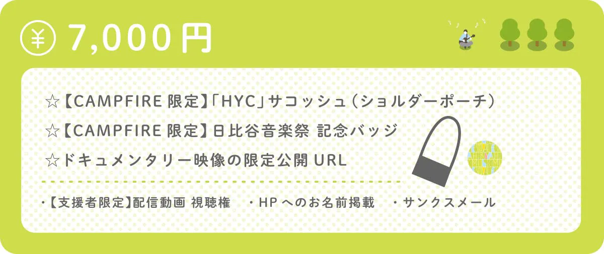 ※一部リターン(バッジ、サコッシュ)のお受け取りは、日比谷音楽祭当日、会場内の「クラウドファンディングブース」でお受け取りいただくか、後日郵送(2020年8月頃)でお受け取りいただくかをお選びいただけます。