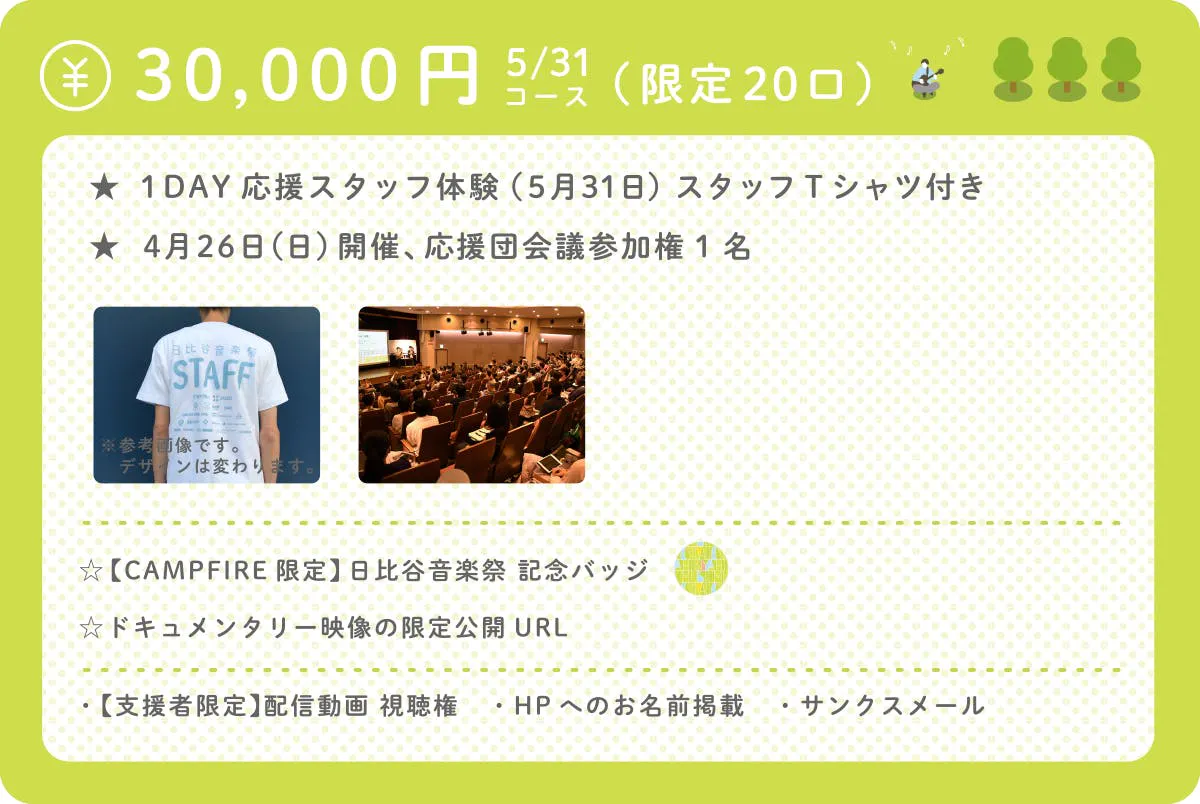 日比谷音楽祭での1DAYスタッフ体験ができるスペシャルプラン! スタッフTシャツを着て、日比谷音楽祭を一緒につくりましょう!!