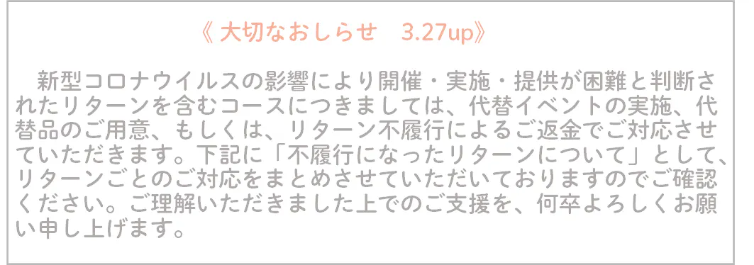 ※新型コロナウィルス感染拡大の影響によるリターンの不履行の際のご対応については、下記の「不履行になったリターンについて」を必ずご確認ください。