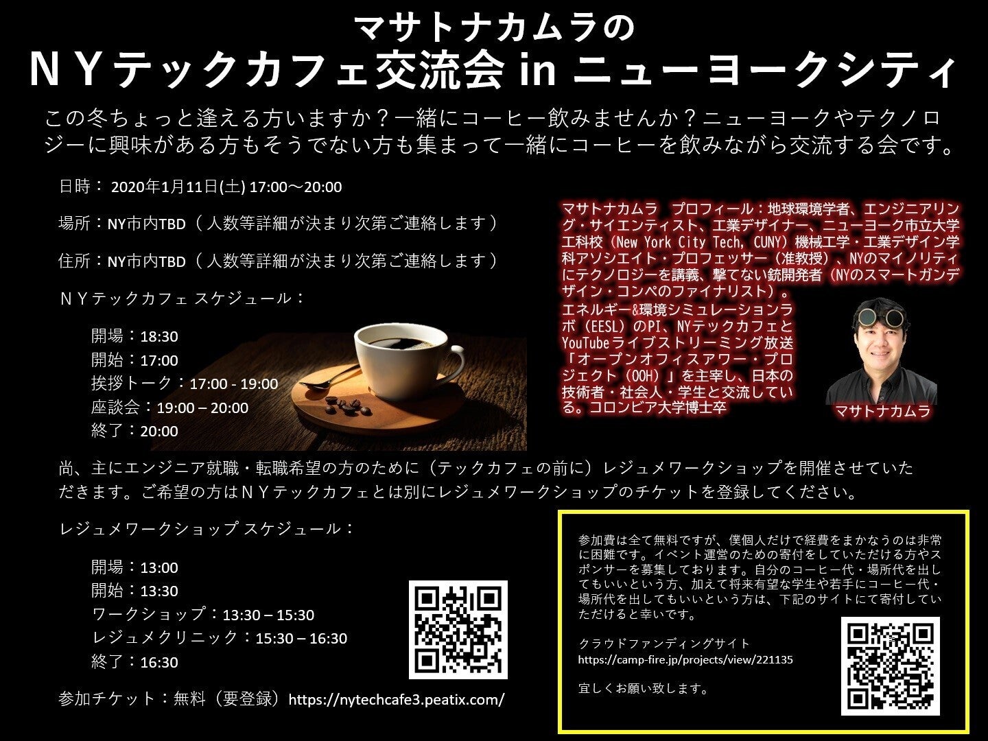 2020/01/14 15:37支援してくれた方々に心より感謝致します。ありがとうございます。(支出報告は本クラウドファンディング満了日(1/15/2020)以降にさせていただきます)NYテックカフェinニューヨーク・シティ無事終了しました。新年(2020年)が始まり2週間もしない1/11土曜日開催で、今回のNYテックカフェは札幌、東京、に続き三回目となりました。初めてアメリカで行ったので、NYCでのカフェスペースの確保が難航しましたが、20名以上の方が参加してくださり、Brooklyn Roasting Companyから仕入れたコーヒー豆を使っていれたコーヒーを一緒に飲みバックヤードで交流を深めました。そしてあらためて皆で自己紹介をした後、様々なトピックで実りのあるディスカッションをすることができました。今回もすごい仲間たちが集結して、ディスカッションして僕は思いました。未来はそんなに悪くない、みんな素晴らしい未来を考えてるんだ、と。また、テックカフェの前に行われたレジュメワークショップも6名(オンライン1名)の方が参加していただき、限定4名の個別カウンセリングも満員になりとても有意義なものになりました。また、アメリカでの就職・転職活動を通して、自分の生き方を職を通して真剣に探しキャリアアップに取り組んでいる方々と交流できたのことで僕も刺激を受けました。次回またお逢いできる頃には僕達はもっともっと成長しているんだと思います。いつか再会できることを願って。。参加された方々の感想:参加者RIさん:本日は中村教授(@MasatoNakamura )主催の #NYテックカフェ に参加させていただきました。マサトさんはTwitter通りの気さくないい方で、普段お会いできないような方々とも会うことができて非常に有意義な時間を過ごさせていただきました! 私も信念を持って何かに取り組めるかっこいい大人になりたいなぁ 。参加者REさん:マサト教授が主催のテックカフェに参加してきました! 勉強になったし、ハイレベルな人達に会えて、一緒に議論してモチベーションがすごく上がった。学生という立場でも楽しめ、たくさん学べるイベントでした! 次回までにもっと成長できるよう頑張ります!^ ^参加者GTさん: とても勉強になり、そして、これからも自分の挑戦を続けようと励みになりました!お忙しい中、このような貴重な会を開いて下さりありがとうございました!!参加者TAさん:昨日はマサト先生の#NYテックカフェに参加。幅位広い年齢層で色々な業界の方がいて、いい刺激になりました。特に、Simulation Hypothesisの議論とSmart Gunのお話しが楽しかったです。次回のクラウドファンディングはGofundmeなどUSDでファンドできるチャネルもご検討ください。参加者MAさん:マサトきょーじゅ、今日は一日本当にお疲れさまでした。今日の会に参加できて&お話を聞けたことは2020年最初の神様がくれたLucky&Happyだと感じています。 教授のpassionは、同じNYに住む日本人として参加者全員に届いたと私は確信していますし、 少なくとも私にとっては、今日はどこを切り取っても素晴らしい一日でした!こうした場を作ってくださったことに心から感謝しています。また次回お会い出来るのを楽しみにして、自分を成長させます ! 普段はテック業界との接点が少ない自分でも、シミュレーションというテーマを通してテクノロジーと私たちの未来の可能性をディスカッションしながら考えてみたり、環境問題と電気といった日常の疑問点にも教授がわかりやすく解説してくださったりと、予備知識がなくても十分に楽しみ学びの多い場となりました!http://masatonakamura.tech/2019/12/18/nytechcafe3/ もっと見る明日開催アップデート2
