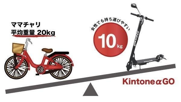 Kintone α GOの重量は約10kgです。こちらはママチャリの半分、お米10キロと同じです。コンパクトに折りたたみ、肩にかければ、多くの方が持ち運びできる重量です。(持ち運びできるかどうかは個人差もありますので、事前にお米やペットボトルなどでシミュレーションお願いします)