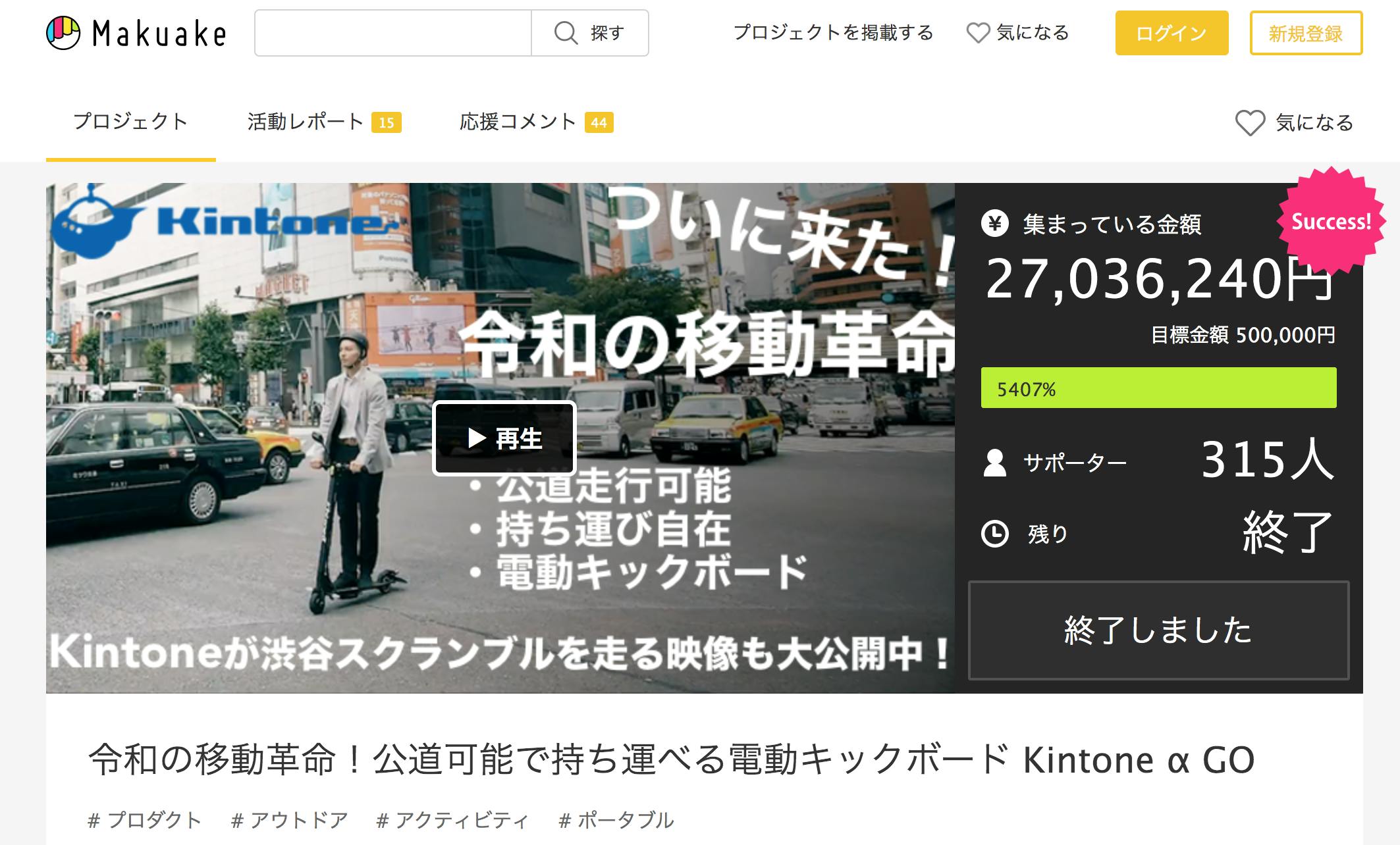 日本初上陸!史上最高スペックの電動キックボード「Kintone motion」実績720万円