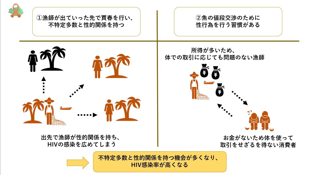 漁師という職業は世界的に見てもHIV感染リスクの高い職業であることが知られています。遠洋漁業に伴って職業柄移動する距離が長くなり、滞在先で性的関係を持つことや、家庭という場を長期間離れることにより、不特定多数の相手と性的関係を持つといった要因がHIV感染率を高めてしまっています。