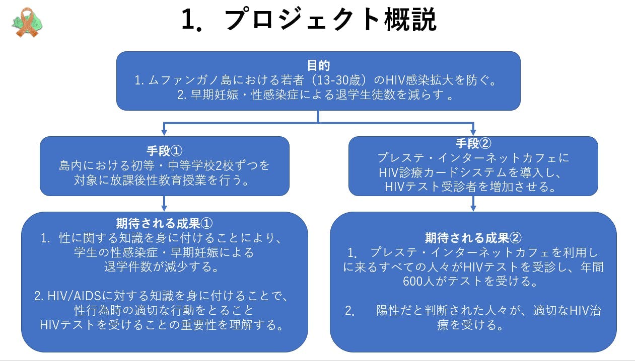 このプロジェクトは、ケニアの中でも特にHIV感染率の高いムファンガノ島で、特に若者(13-30歳)をHIVの脅威から守るために企画されました。プロジェクトの目的として、以下の2つを掲げています。