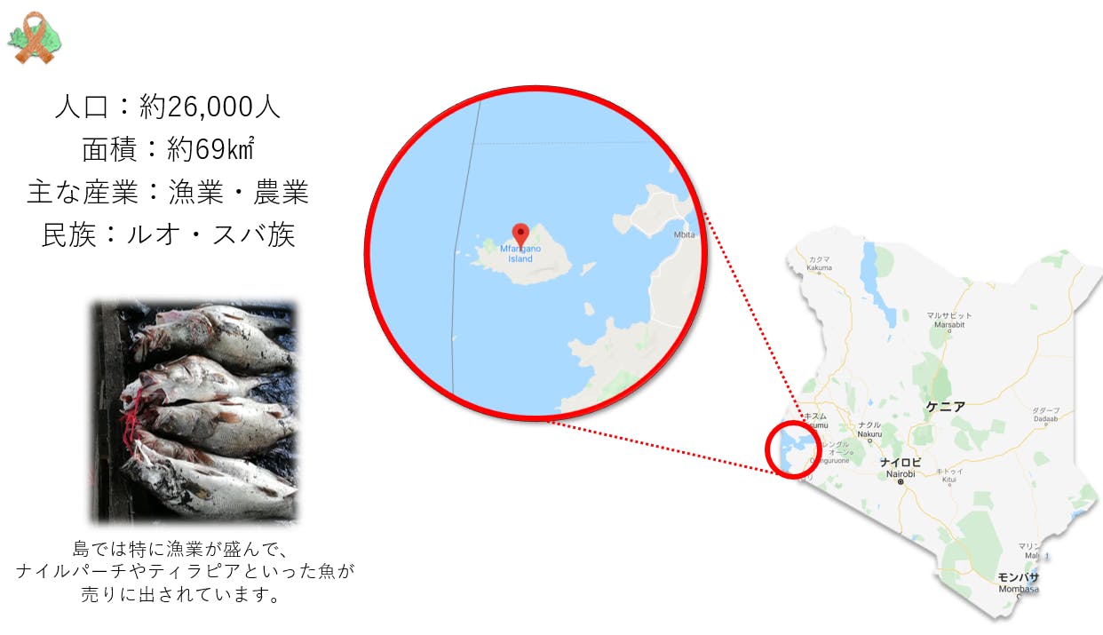 ムファンガノ島は、アフリカ最大の湖・ビクトリア湖に浮かぶ大きさ約69㎢ほどの島です。人口統計は見る資料によってバラツキがありますが、26,000人程度の人口規模にあります。島の主な産業は漁業・農業から成り立っています。島民の多くが漁師であり、ビクトリア湖での漁業は「ダーウィンの悪夢」という映画の題材にもなっています。ナイルパーチやティラピアといった魚が島ではよく売りに出されています。