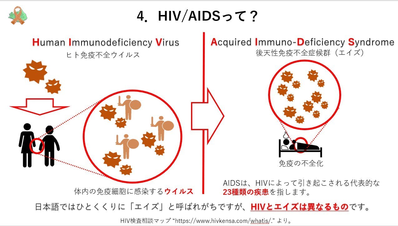 HIV(ヒト免疫不全ウイルス)は、体内の免疫細胞に感染し、免疫不全を引き起こすウイルスです。HIVが引き起こした免疫不全によって発症する病気をAIDS(後天性免疫不全症候群)と呼びます。日本語だとエイズと一括りにしてしまいがちですが、HIVはウイルス、AIDSはHIVによって発症した疾患を指します。