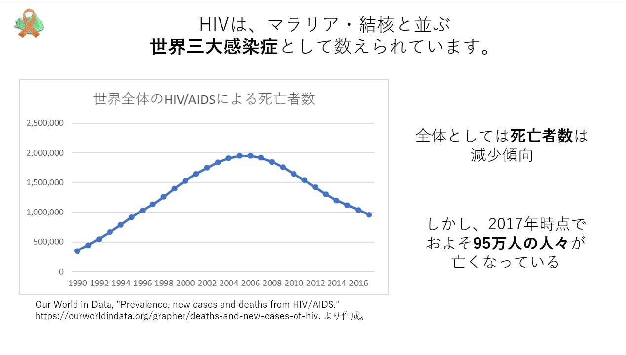 マラリア・結核と並んで世界三大感染症に数えられるHIV/AIDSは、2005年にはおよそ195万人もの命を奪いました。それをピークに死亡者数は減少しつつありますが、2017年時点でいまだ約95万人もの人々が世界でHIV/AIDSにより命を落としています。