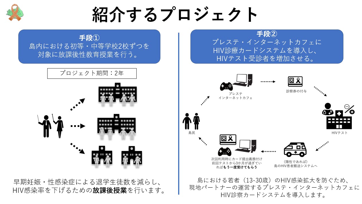 の2つの手段を島民へ届けるためのプロジェクトを、このクラウドファンディングを通じて実行します。そのために、ケニア・ムファンガノ島でHIV/AIDSと戦うため2つの計画を準備しました。一つは、初等・中等学校に対してHIV/AIDS・性教育の授業を行い、HIV感染を予防すること。もう一つは、既存のプレステ・インターネットカフェにHIV定期テストカードシステムを組み込むことで住民のHIV早期発見を促すことです。