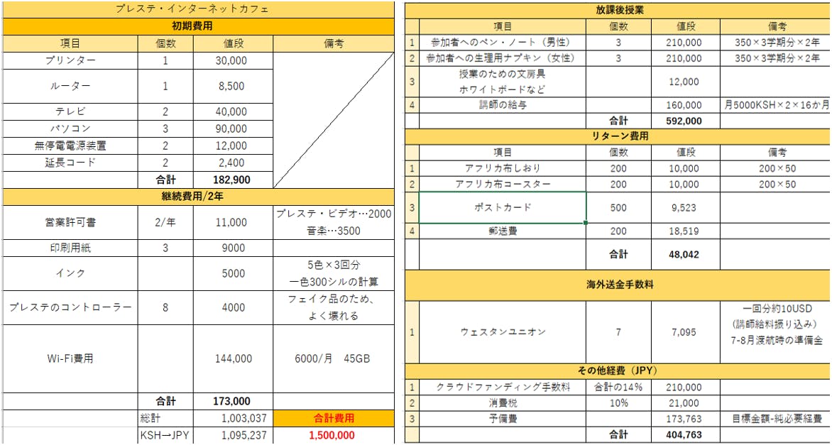 まず、ケビンを含めた保健分野のソーシャルワーカーの方々への給料が必要です。加えて、プレステ・インターネットカフェの拡大のための設備費用が必要です。