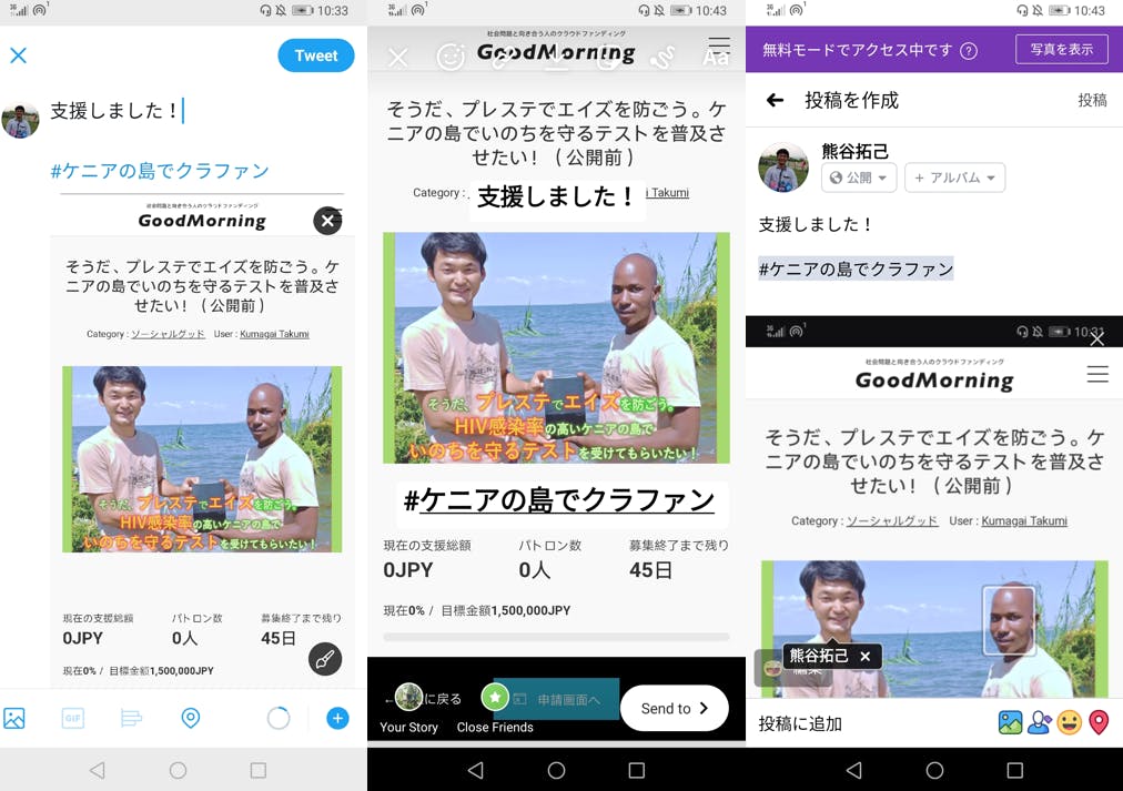 ご支援いただきありがとうございます!実はもう一つお願いがあります!プロジェクトをたくさんの方に知ってもらうために、下記のように画面をスクショしていただき、「支援しました!」と#ケニアの島でクラファンのハッシュタグとともにお使いのインスタグラム、ツイッター、フェイスブックなどのSNSでシェアしていただけないでしょうか!よろしくお願いします!