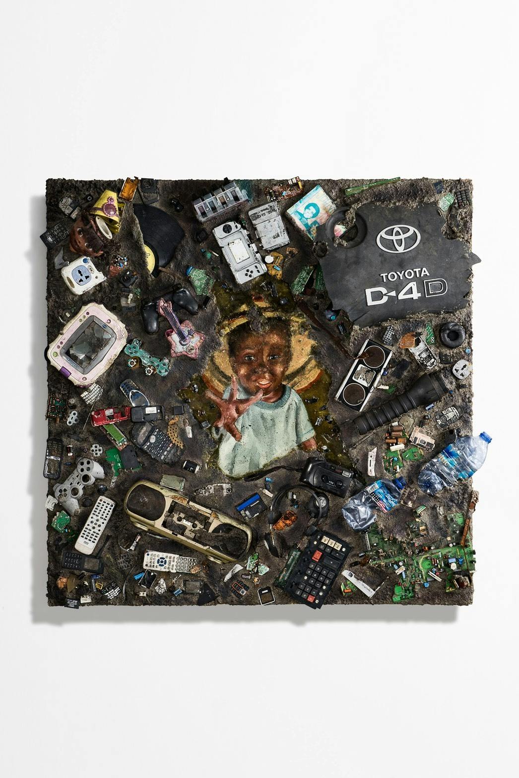 帰国後、スラムでも不必要になった電子機器ゴミを持ち帰り、それでアートを製作。