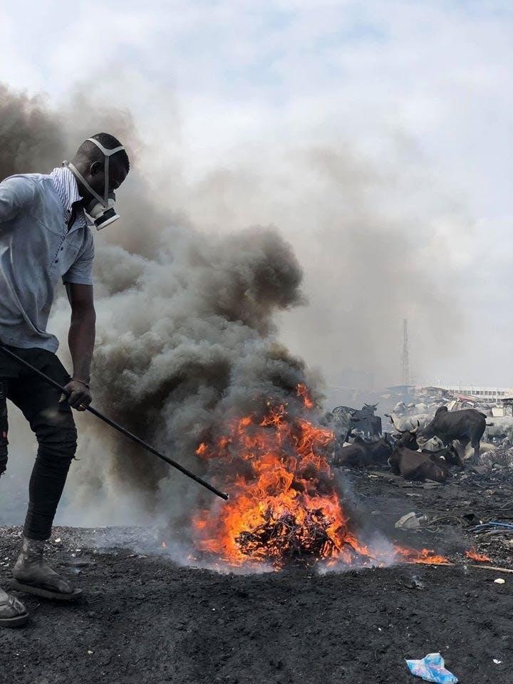 電化製品を燃やし中の金属を取り出す、焼き場の若者。 猛毒ガスと灼熱の中行われる。