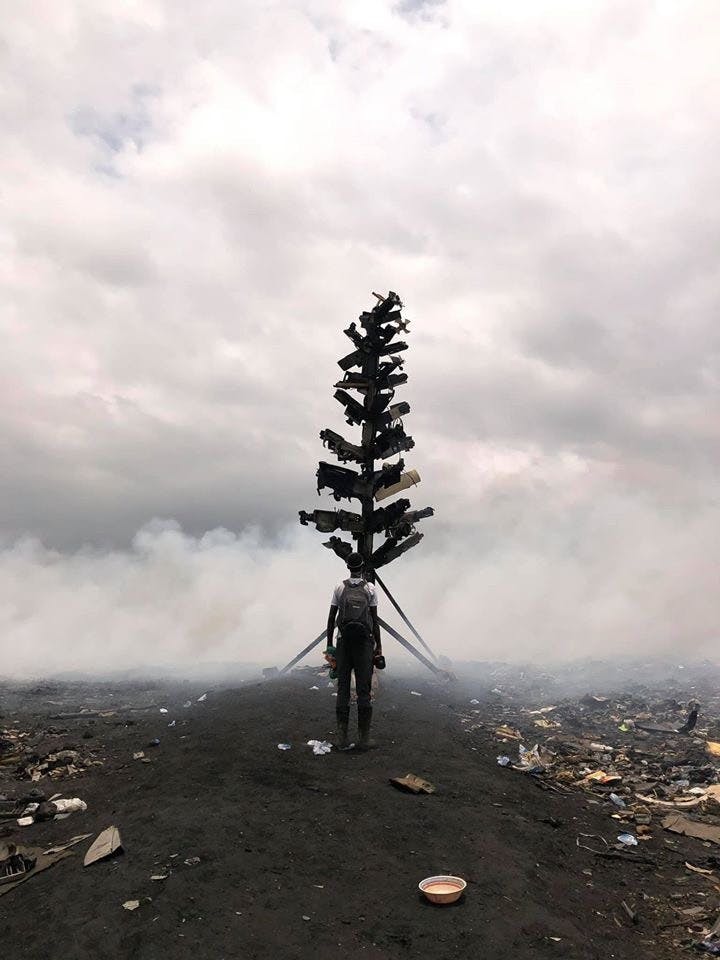 「E-WASTE TREE」 電子は器物で作れらた焼き場にそびえ立つ7mの作品
