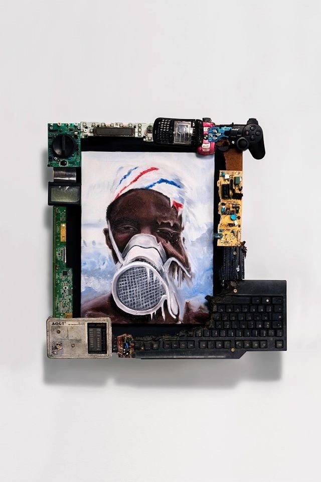 帰国後、スラムでも不必要になった電子機器ゴミを持ち帰り、それでアートを製作。
