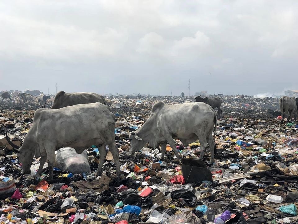 プラスチックの混ざった、腐敗した玉ねぎを食べる牛たち。彼らは食用として加工され、出荷されます。