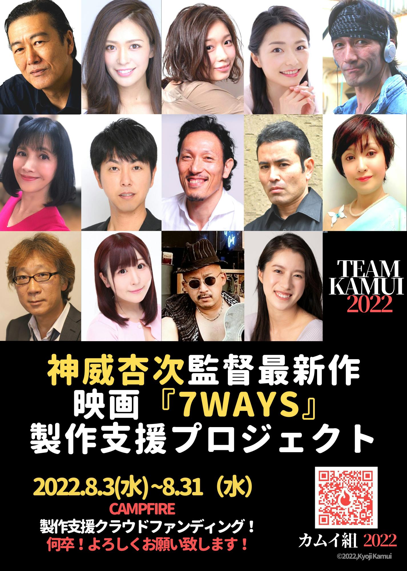2022/08/01 18:41お世話になります、神威杏次です。このたび『スモーキー・アンド・ビター』『ムーンライト・ダイナー』に次ぐ神威組新作『7WAYS』の製作支援クラウドファンディングが、いよいよ8月3日(水)7時~にスタート致します。 ▼「神威杏次監督最新作『7WAYS』製作支援プロジェクト』https://camp-fire.jp/projects/view/610582よろしければ!!前作、前々作に引き続き、何卒、皆さまの応援を賜りたくお願い申し上げます。開始から3日間限定のスタートダッシュ・キャンペーンは昨年同様。そのほか、数量限定キャンペーンも2種類ございます。今後の、新キャンペーンや、また、到達記念の新リターンなども、追々、できる限り、追加したいと思案中です。どうか、また、僕らに映画を撮らせてください!お力をお貸しください!何卒、よろしくお願い致します。2022年8月1日神威杏次 もっと見る神威杏次、ニース国際映画祭にて最優秀監督賞、受賞!のご報告『スモーキー・アンド・ビター』