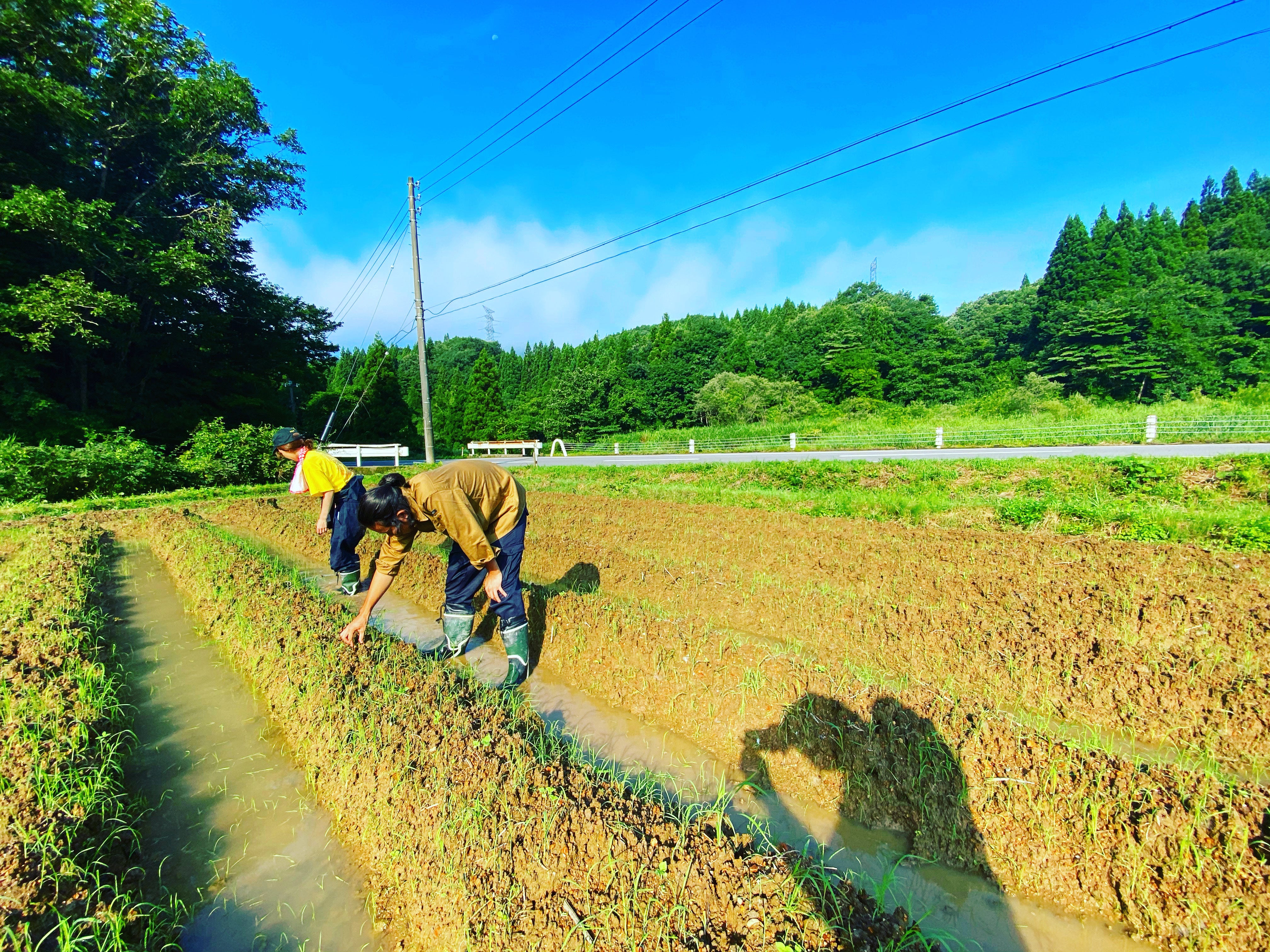 移住後、集落の日曜朝の合同草刈りに参加し自己紹介をする池上と高倉。