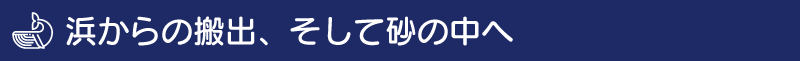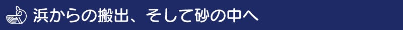 第1段階は、骨のない胸ビレと尾ビレをトレースした後で肉や内臓を細かく切り分けて骨を取り出し、それらを波打ち際から海水が来ない場所まで移します。第2段階は、海岸から崖の上までの急斜面にワイヤーを張り、ゴンドラのようなものを設置して宙吊りで骨を海岸から運び出します。
