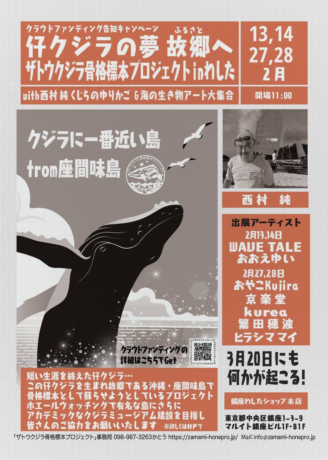 2020/02/12 19:232月13日(木)11:00~20:00、14日(金)11:00~18:30、銀座わしたショップ本店にてクラウドファンデイング応援イベントを開催します!ザトウクジラの魅力を凝縮した西村純さんの写真展と、海の生き物をテーマとしたアーティストのグッズの販売などがあります。座間味島からは島のアトリエ☆KIRARIのイラストレーター大江ゆいさんがかけつけます。また、シーグラスによるアクセサリー作品で有名なクリエイターWAVETALEさんも登場!骨格標本を含む「ザトウクジラの故郷」である座間味島を感じられるイベントです。なお、西村純さんのザトウクジラのパネルは28日までイベント会場で展示される予定ですので、お近くの方はお仕事帰りなど是非お立ち寄りください。銀座わしたショップ本店https://www.washita.co.jp/info/shop/ginza/東京都中央区銀座1-3-9 マルイト銀座ビル1F・B1F・JR有楽町駅 京橋口改札を出て徒歩4分・地下鉄有楽町線 銀座1丁目駅 3番出口の階段を上がってすぐ・地下鉄銀座線・日比谷線・丸の内線 銀座駅より徒歩7分 もっと見る