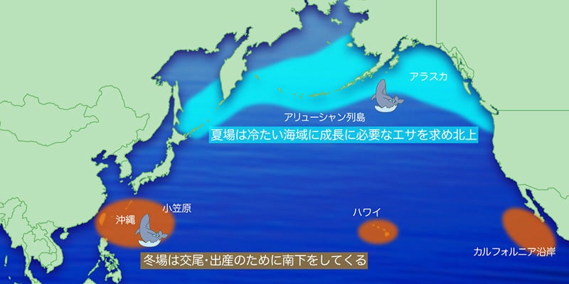 北半球のザトウクジラは、冬から春にかけて暖かい海で出産・子育てをします。日本では主に小笠原諸島と沖縄県座間味島近海が、海外ではハワイやメキシコのカルフォルニア湾などがこの海域にあたります。冬から春にかけて南の海で出産と子育てを行い、海水の温度が上がってくると餌を求めて北の海へ向かって移動する、そしてまた冬になると生まれた場所に戻ってくるのです。