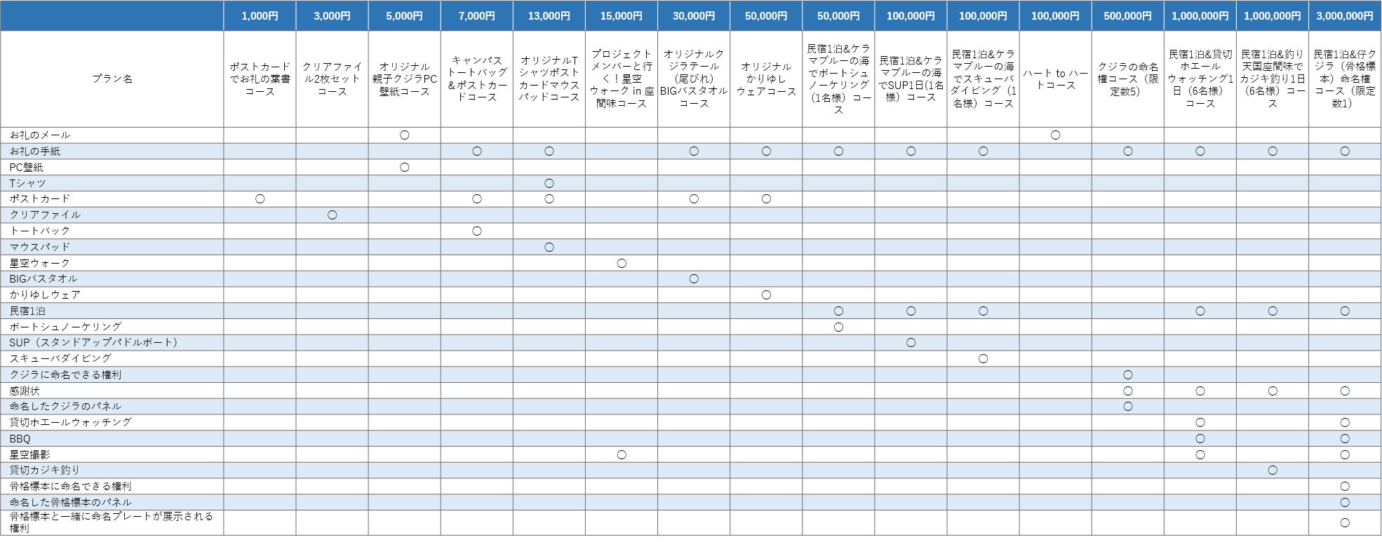 ザトウクジラ骨格標本プロジェクトでは、ここだけの特別な返礼品をご用意しております。お金で買えない価値のあるものとしては、座間味で見られるザトウクジラや、プロジェクトの主役である骨格標本への命名権があります。また、村を訪れたことがある方もない方も、座間味村の美しい海や自然、そしてザトウクジラの魅力を感じていただける内容をご準備しました。沖縄・自然・海を愛するデザイナーや、座間味村在住のカメラマンによるプロダクトの数々、座間味の海の魅力を存分に満喫できるアクティビティーをお楽しみいただけます。
