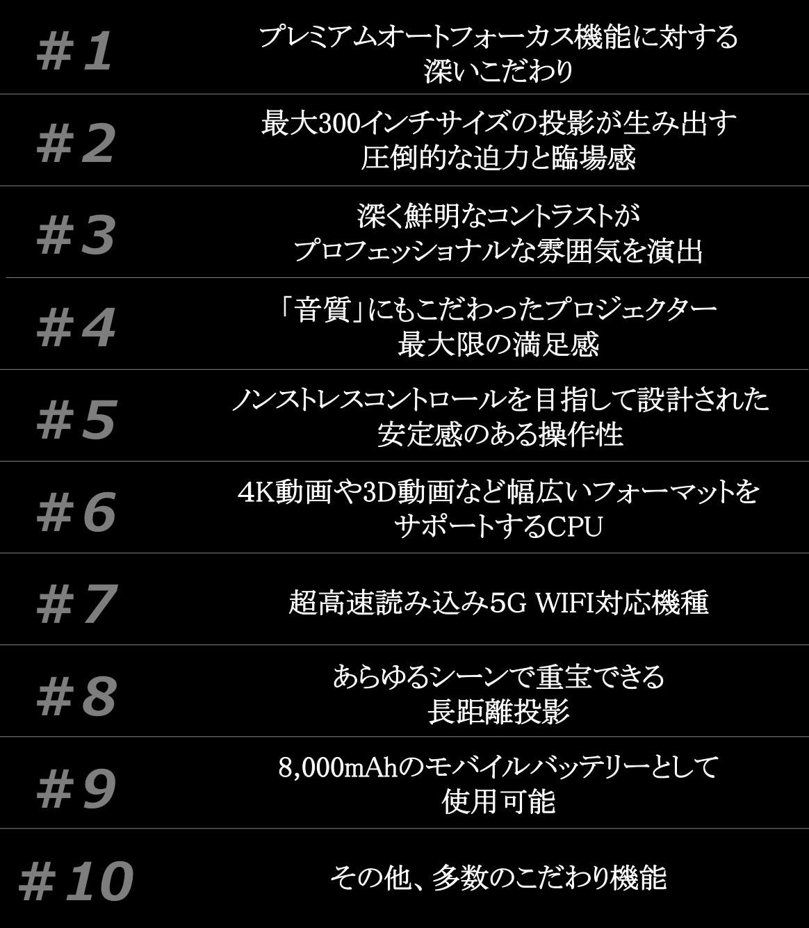 「響輝」の最も大きな魅力の一つが、プレミアムオートフォーカス機能です。現在販売されている一般的な家庭用小型プロジェクターは、マニュアルでフォーカスを調整する手間がありました。既にマニュアルフォーカスの家庭用プロジェクターをご使用されている方は、これがいかにストレスなのかご存知でしょう。