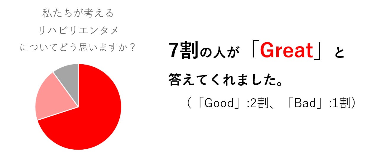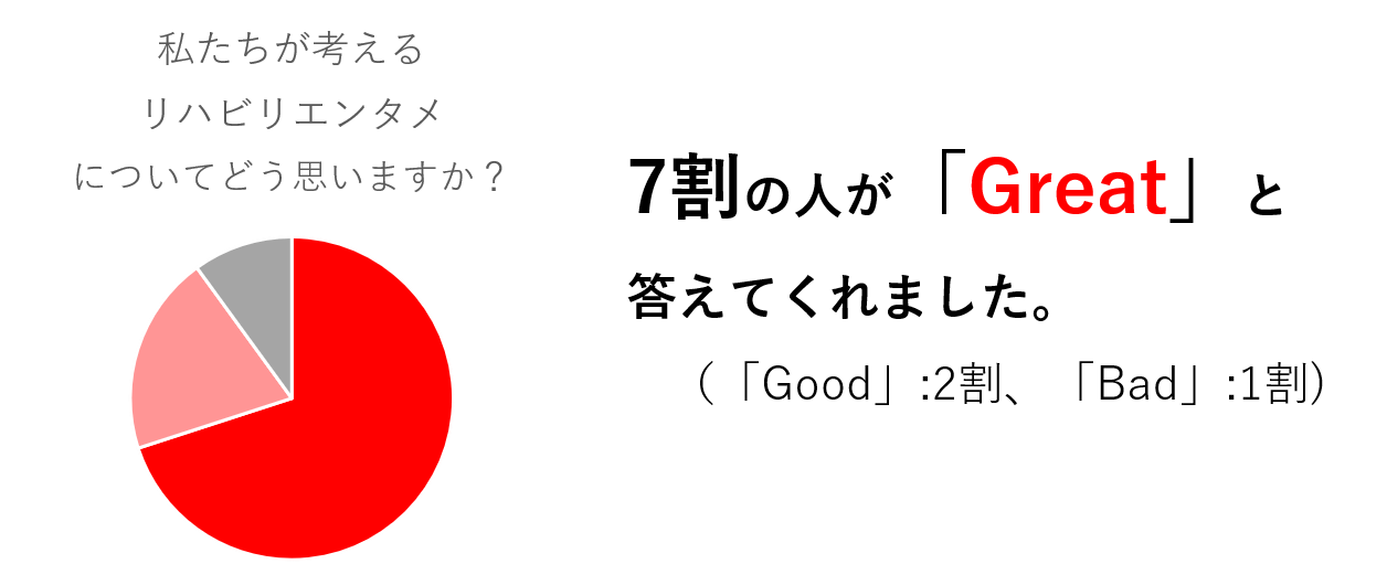 我々のコンセプトは、リハビリ経験者から高い評価を得ています。我々は、実際にこのリハビリエンタメのコンセプトへの感想をリハビリ経験者に聞いてみたところ、実に70%もの人から「Great」との回答を頂きました。