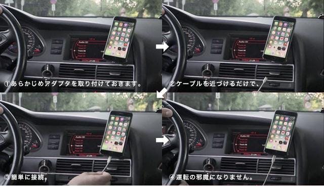 車の中でもケーブルを近づけるだけで磁力を利用してカンタンに接続します。