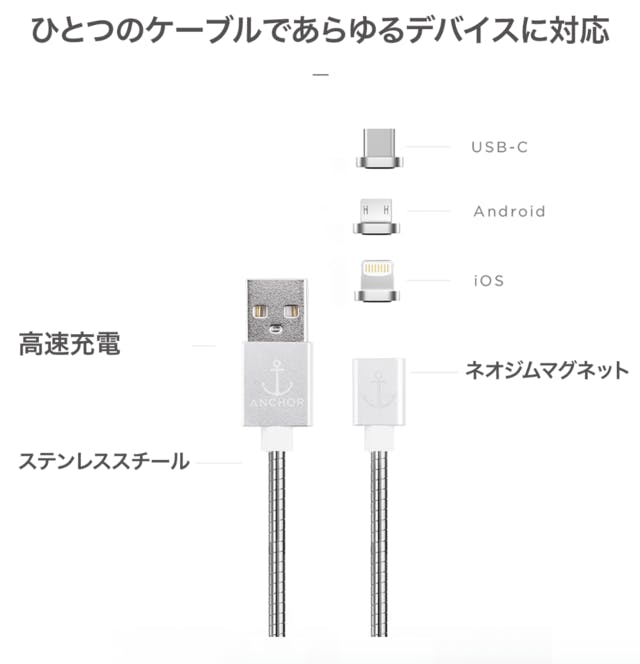 ケーブルの端子は、付属の端子を交換することによりAndroid、iOS、USB-Cのすべてと互換性があります。自分の使っているスマホに合わせた端子をはめ込めば、マグネットによって簡単にチャージが可能となります。装置との接続部分には強力なネオジムマグネットが使用されており、片手で簡単に充電できます。