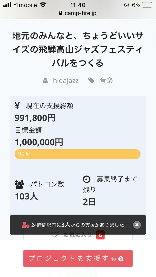 2020/02/28 11:57クラウドファンディングも、残すところあと2日となりました!おかげさまで、多くの方にご支援をいただけて、目標としているゴールにたどり着けそうです。応援していただいている皆さま、本当にありがとうございます。ゴールは目前となっていますが、気を抜かずに残りの日数も走り抜けたいと思います。最後までどうぞよろしくお願いします!2020/5/23(sat) 12:00-23:00飛騨高山ジャズフェスティバル 2020https://hidatakayama-jazz.com/ もっと見る