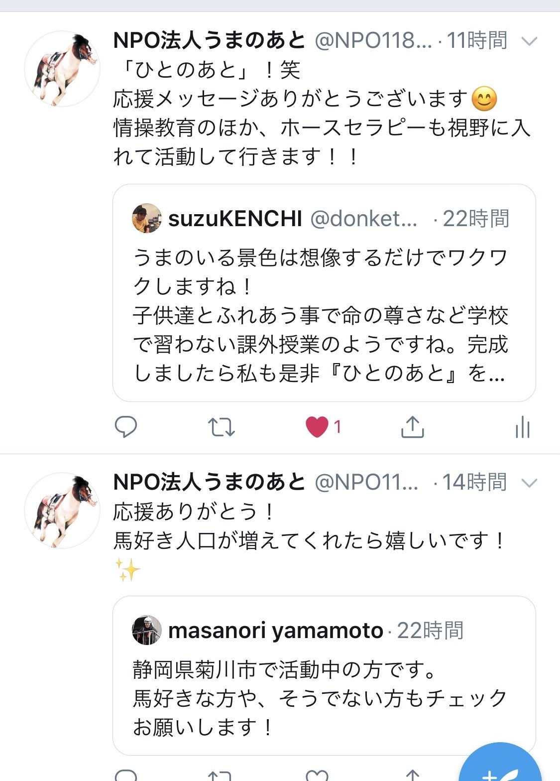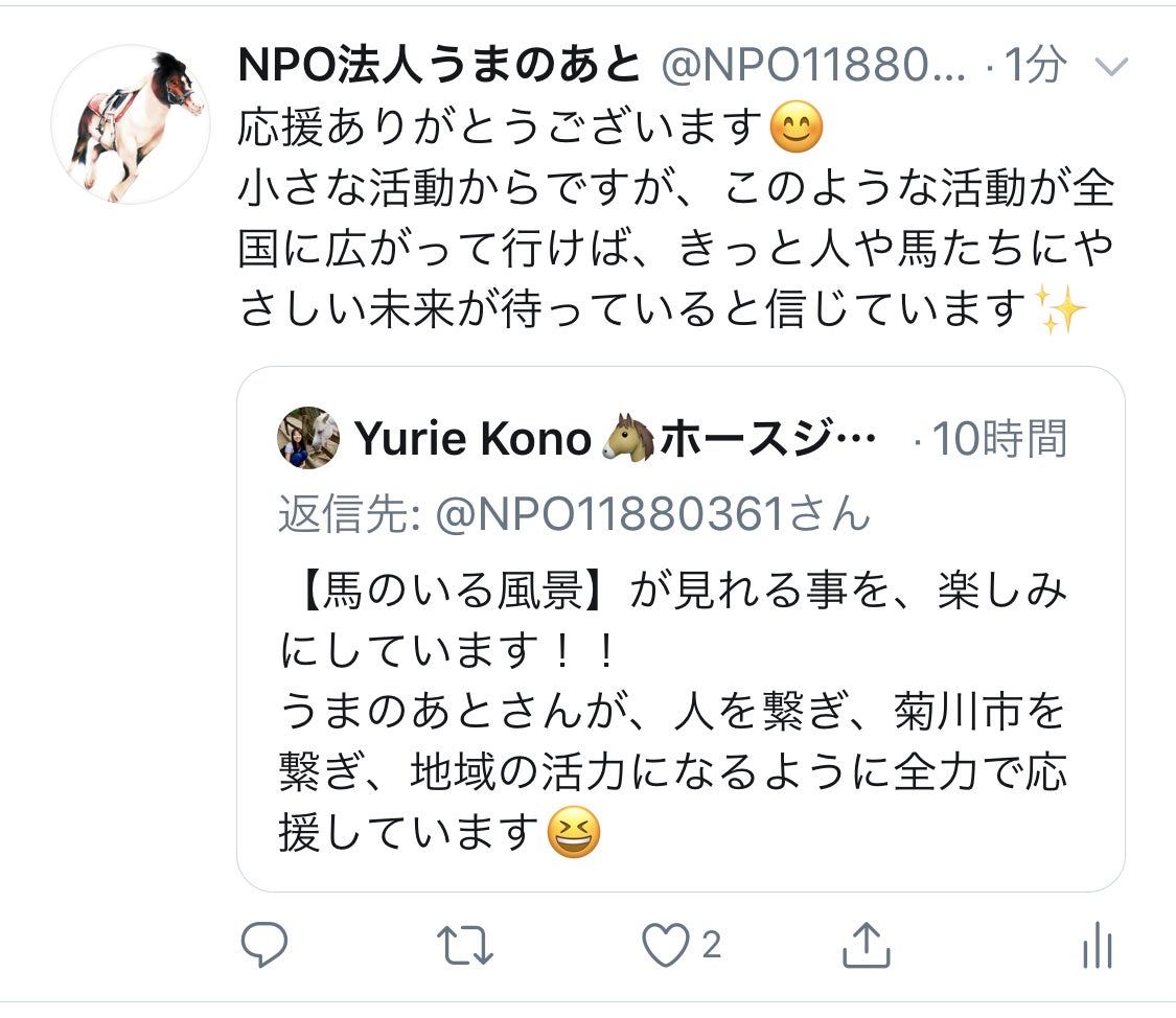 2020/04/28 11:03目標金額 50万円達成しました。ご支援並びにご協力頂きました方々に感謝致します。しかし、まだ期間は残されています。モヒカン君には「気持ちよく」仕事をしてもらいたいので、新品の馬具をプレゼントしたいなと考えています。期間は短くなりますが、引き続きサポートの程、宜しくお願い致します。本当にこのプロジェクトを実施するにあたり、色々な方との繋がりができたことを、一番の成果であったと感じております。そして、クラウドファンディングが終了した後も、講演会やプロモーション動画などの使命(返礼)がありますので、気を抜かずに頑張りたいと思います。今後も、活動報告を「うまのあとホームページ」内のブログで更新していきますので、お楽しみにして下さい。(出来る限り毎週頑張りますw)。プロジェクト終了時に改めましてお礼申し上げます。 もっと見る