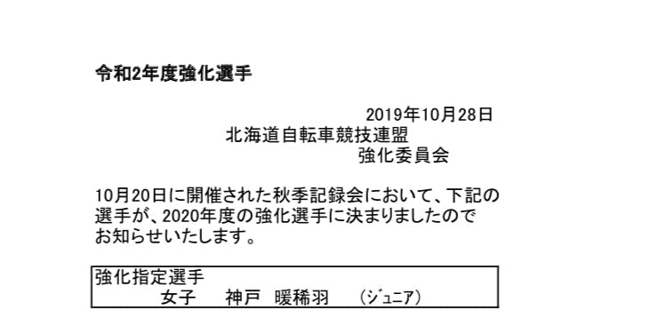 そして2020年度は、北海道から男女合わせて唯一1人だけ、自転車競技強化指定選手に選ばれました!