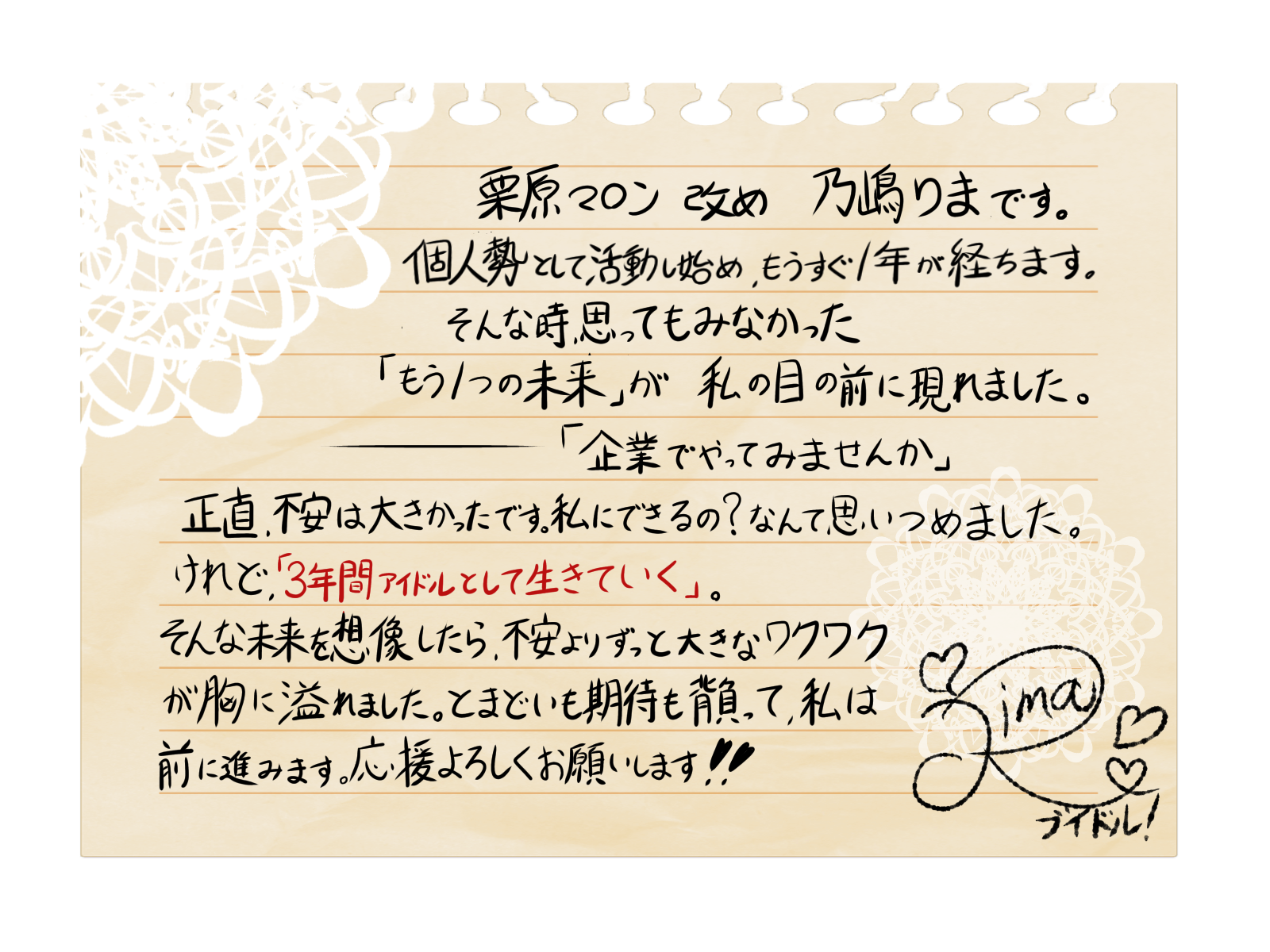 乃嶋りまからの心のこもった内容をメールにてお送りいたします。