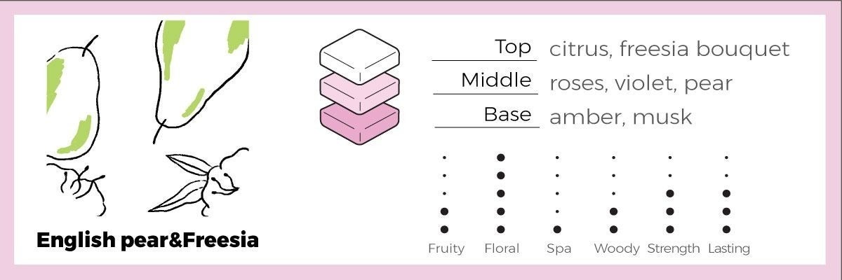 輝く太陽をいっぱいに浴びて熟した梨の新鮮な香りとフリージアの花の軽くて明るい香りがうまくブレンドされています。アンバーとムスクのパウダリーな残り香が優しく香り、強い香りが苦手な方にもピッタリです。(おすすめの場所:リビング、部屋、玄関)