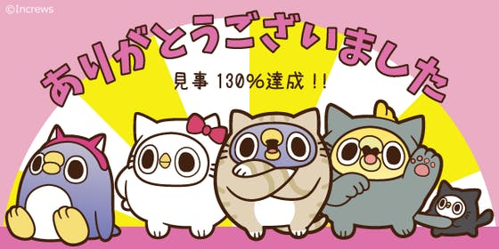 2017/04/27 18:43皆様のお力で目標を超える130%達成にて、無事にクラウドファンディングを終了することができました。 これから「ネコめんトリ」ぬいぐるみ、そしてストレッチゴールのクージー制作を進めます✊✨ 引き続き応援のほどよろしくお願いします!! もっと見る