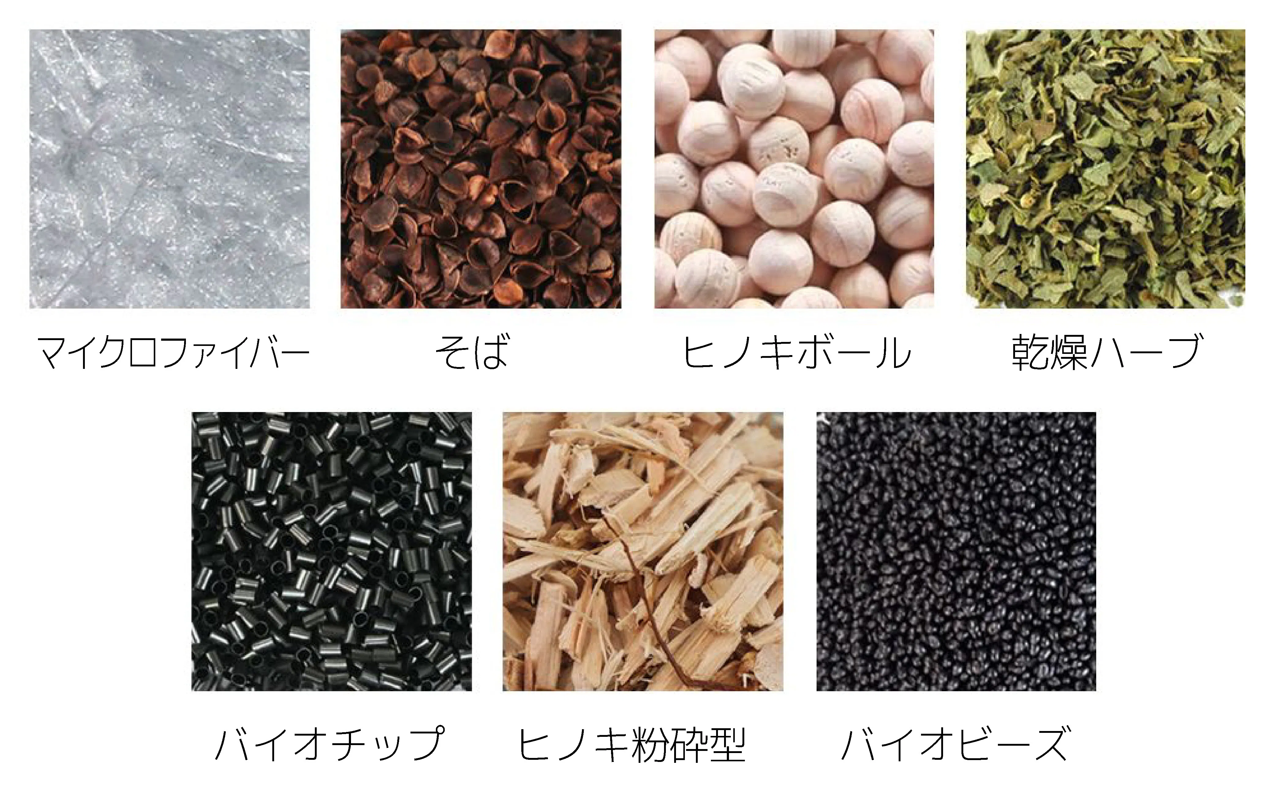 ヒノキは虫が嫌う濃い香りと抗菌作用で知られています。蕎麦の皮の長所だけを取り入れるため細かく粉に砕いたヒノキのチップを補強しました。