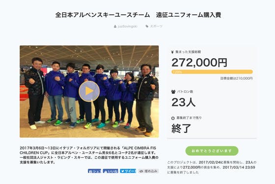 2017/03/15 01:02先ほど、プロジェクトの募集期間が終了しました。 目標金額を上回るご支援をいただきました皆さまに、関係者を代表して心より感謝申し上げます。本当にありがとうございました。 今回イタリア遠征した全日本ユースチーム選手・コーチ達は、すでに次のステップに向けて動き出しています。 一般社団法人ジャスト・ラビング・スキーでは、2026年冬季オリンピックのアルペンスキー種目で表彰台に立つ日本人選手を育てるために、全日本ユースチームと連携し、そのサポートをより充実させていくつもりでおります。 これからも引き続きのご支援をお願いいたします。また、こうした活動をしている法人の存在をできるだけ多くのお知り合いの方に知らせていただきたく、併せて、お願い申し上げます。 当法人では、チーム支援を目的としてお預かりした支援金からは一切の手数料を頂いておりません。今回のプロジェクトの余剰金につきましては、当法人が責任をもってお預かりし、全日本ユースチームの活動費として有効に活用いたします。 当法人では、当法人の運営費のご支援をいただける方を賛助会員として募集しております。 お問い合わせは「info@jls.or.jp」までメールでご連絡ください。 一般社団法人 ジャスト・ラビング・スキー理事 谷 祐輔 もっと見る