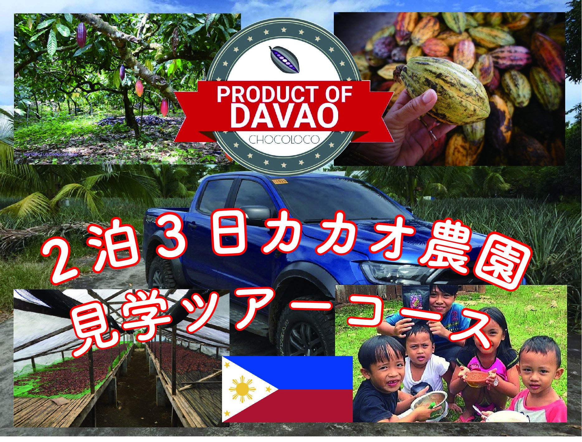 フィリピンのカカオ一大生産地の「ダバオ」へ農園の見学ツアーにご招待いたします!CHOCOLOCOの現地農園を見学しながら、カカオ農場の見学、工場、生産過程、現地ローカルガイドなど、余すことなくご案内します!本物のカカオを直でみられる機会は滅多にありませんし、CHOCOLOCOプロダクトの製造過程を見れるチャンスです。日本語ガイドも同行しますので、英語が喋れなくてもOK!