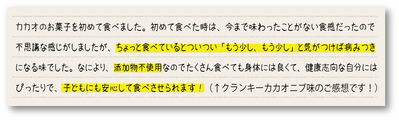 しかしこのCHOCOLOCOのチョコレートフードは、とにかく美味しく、その上僕が目指していた無添加で安全で、なおかつ普段から日常で食べれるお菓子的な要素を全て満たしていたんです!それが繋がった瞬間、「これだ!これなら僕の周りのおじいちゃんおばあちゃんに、『食べて美味しい、そして健康に!』を伝えることができる。」そんな思いでいっぱいになりました。