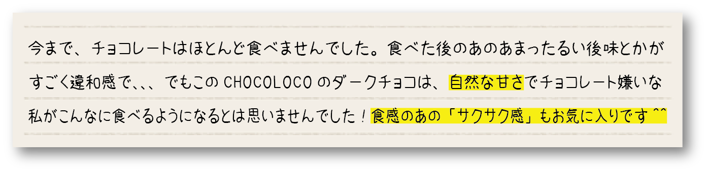 チョコレートの美味しさに「甘さ」は必要不可欠とお考えの方も多いと思います。事実、カカオ単体では苦味が強く「おいしさ」とはかけ離れているかもしれません。ですが、甘さを加えるために精製された砂糖が必要かというと必ずしもそうではありません。なにより、「健康面」を考えた時に「甘さの質」にもこだわりを持たなければなりません。そこでCHOCOLOCOでは、甘さの秘訣として低GI(血糖値の上がりにくさを表す指標)として注目されている糖質「ココナッツシュガー」を使用してます。また、カカオを加工する際も手間暇をかけてカカオ自体の甘さを引き立てる製法にもこだわりを持っています。