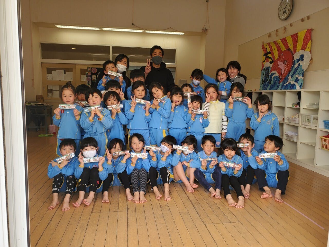 許可がいるところとは思いますが、保育園名、幼稚園名を記載し、集合写真もアップしていければと思います。